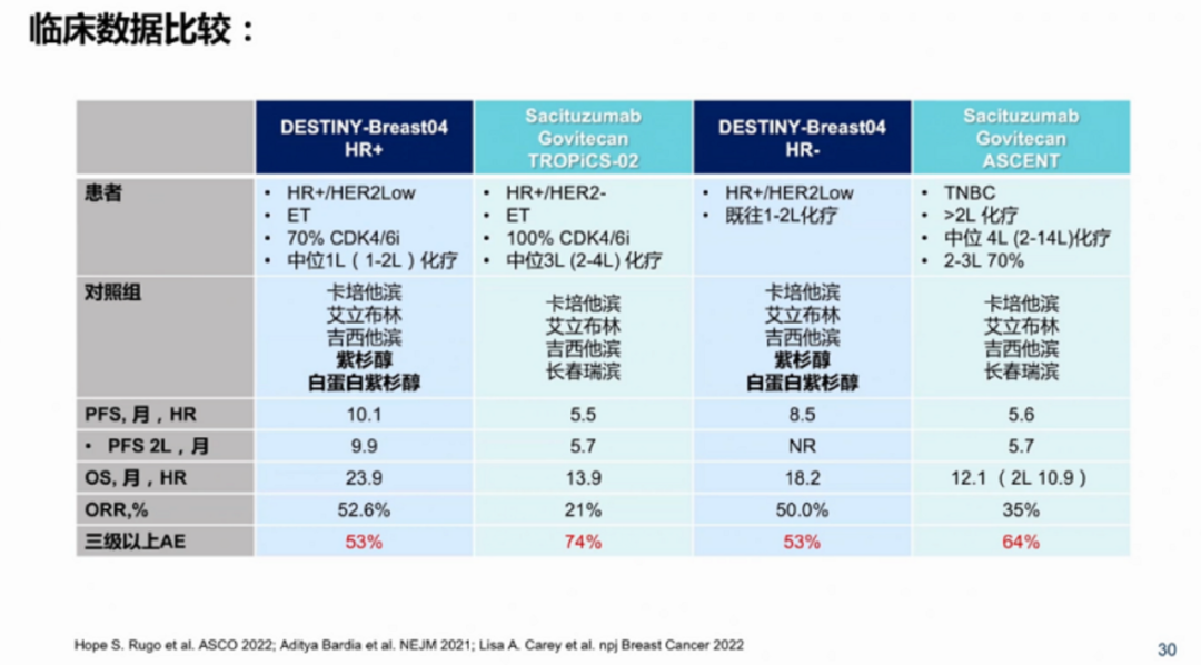 ASCENT研究中针对HER2-Low mTNBC的数据显示,PFS和OS分别为6.2个月和14个月,ORR为32%。DESTINY-Breast04研究中,HR-亚组的PFS和OS则分别为8.5个月和18.2个月,ORR达到50%。尽管不同研究的入组患者基线特征有所差异,ASCENT研究可能更靠后、且均为CDK4/6i进展的患者,但间接来看T-DXd的生存获益似乎更明显,而且安全性也更具优势。TROPiCS-02、ASCENT研究中,SG≥3级AE的发生率分别为74%和64%,而DESTINY-Breast04研究中≥3级AE的发生率约为53%。