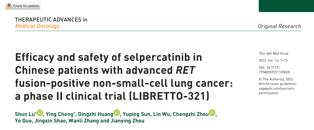 [1]Lu S, Cheng Y, Huang D, et al. Efficacy and safety of selpercatinib in Chinese patients with advanced RET fusion-positive non-small-cell lung cancer: a phase II clinical trial (LIBRETTO-321). Ther Adv Med Oncol. 2022;14:17588359221105020. Published 2022 Jul 28.