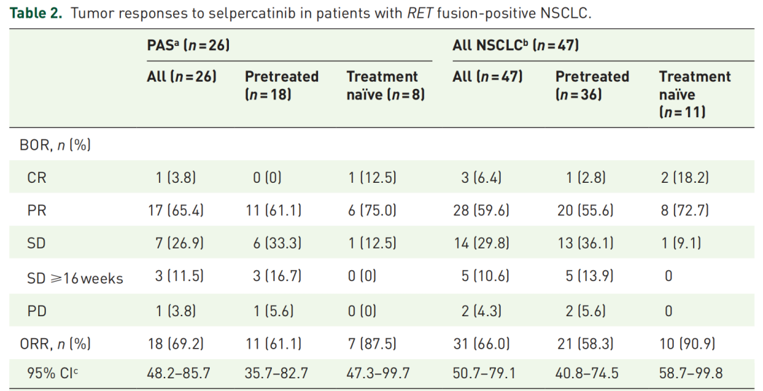这是一项开放标签、多中心、2期研究,入组患者为携带RET基因改变的晚期实体瘤患者,接受Selpercatinib(160 mg,日二次口服)治疗。主要终点是独立审查委员会(IRC)评估的客观缓解率(ORR;RECIST 1.1)。次要终点包括持续缓解时间(DoR)、中枢神经系统(CNS)缓解率、安全性。此次发表于Ther Adv Med Oncol杂志的数据,主要分析NSCLC患者的结果。