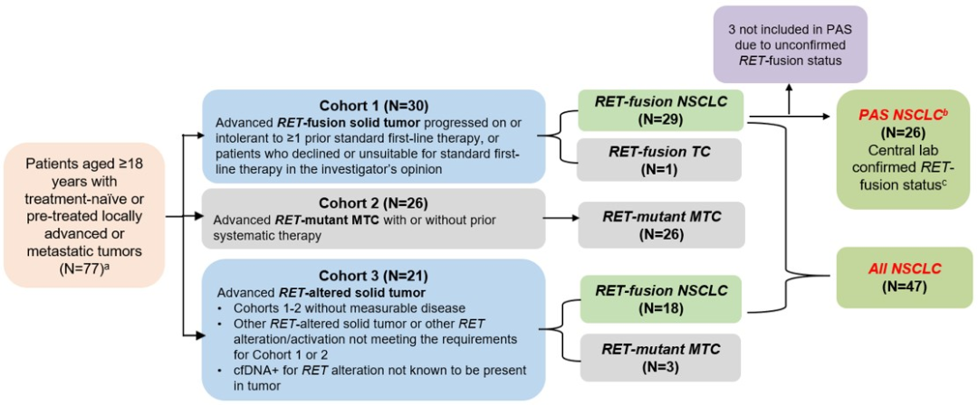 在2020年3月16日至2021年3月25日期间共纳入77例患者,其中47例为RET融合阳性的NSCLC,队列1中26例患者经中心实验室确认为RET融合阳性,纳入主要分析集(primary analysis set,PAS)。此外还有29例携带RET突变的甲状腺髓样癌(TC)和1例RET融合阳性的TC,纳入安全性分析(图1)。