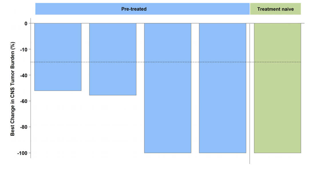 CNS转移患者(n=8)的颅内ORR为62.5%(5/8)。在5例有可测量CNS病灶的患者中,颅内ORR为80%(包括1例颅内CR,3例颅内PR,1例颅内SD)。中位随访时9.3个月时,中位DoR未达到,所有患者(100%)仍在持续缓解中。