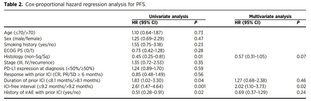 单因素及多因素分析未发现可以影响ORR的临床病理特点,但是非鳞、非小细胞肺癌的病理类型、前线免疫治疗持续时间超过8.1个月、免疫间隔时间超过9.2个月,以及既往存在免疫相关不良反应与较好的PFS相关;经多因素分析发现,仅有免疫间隔时间超过9.2个月与较好的PFS为有关,HR=2.02,P=0.02,而前线接受免疫检查点抑制剂的响应以及是否出现免疫相关不良反应与患者疗效无关。间隔时间为2~6个月、6~12个月、12~18个月、18~24个月及24~30个月的患者,中位PFS分别为1.4个月、1.6个月、4.3个月、2.8个月和8.4个月。