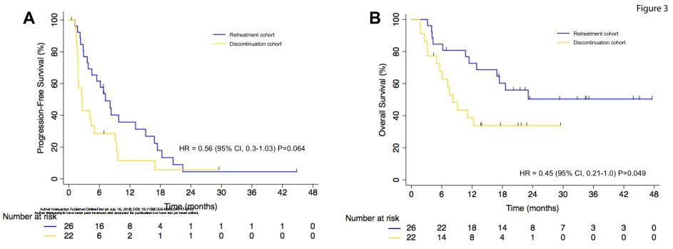 因不良反应而导致治疗中断:这部分患者没有对免疫产生相应的耐药,因此再次接受免疫治疗时有效。2017年的一项回顾性研究发现,对于这部分患者,后续接受免疫和不接受免疫治疗的PFS和OS为的HR值分别为0.56和0.45。因此,接受免疫治疗可以给患者带来相应的获益。
