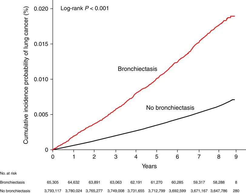 Choi H,et al.Non-Cystic Fibrosis Bronchiectasis Increases the Risk of Lung Cancer Independent of Smoking Status.Ann Am Thorac Soc.2022;19(9):1551-1560.doi:10.1513/AnnalsATS.202111-1257OC