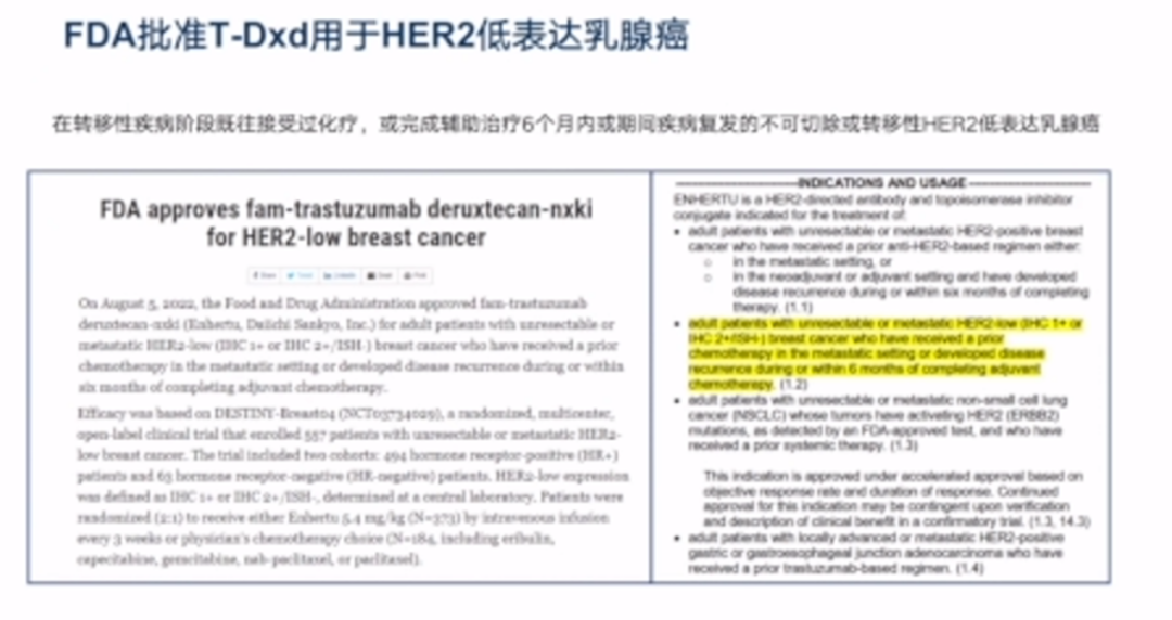 DESTINY-Breast04(DB-04)研究是T-DXd在晚期HER2低表达乳腺癌患者中开展的Ⅲ期临床研究,目前公布的数据显示,HR+人群mPFS达到10.1个月,OS达到23.9个月;且在HR阳性患者人群、全人群中均获得了PFS和OS的获益。在HR阳性亚组人群中,无论患者既往是否使用过CDK4/6抑制剂,是否有内脏转移,T-DXd都显示了较好的获益。基于此,FDA批准了T-DXd的新适应症:T-DXd用于治疗HER2低表达(IHC 1+or IHC 2+/ISH-)不可手术切除或转移的成人乳腺癌患者,转移的患者既往接受过化疗或患者完成辅助治疗6个月内或期间复发。