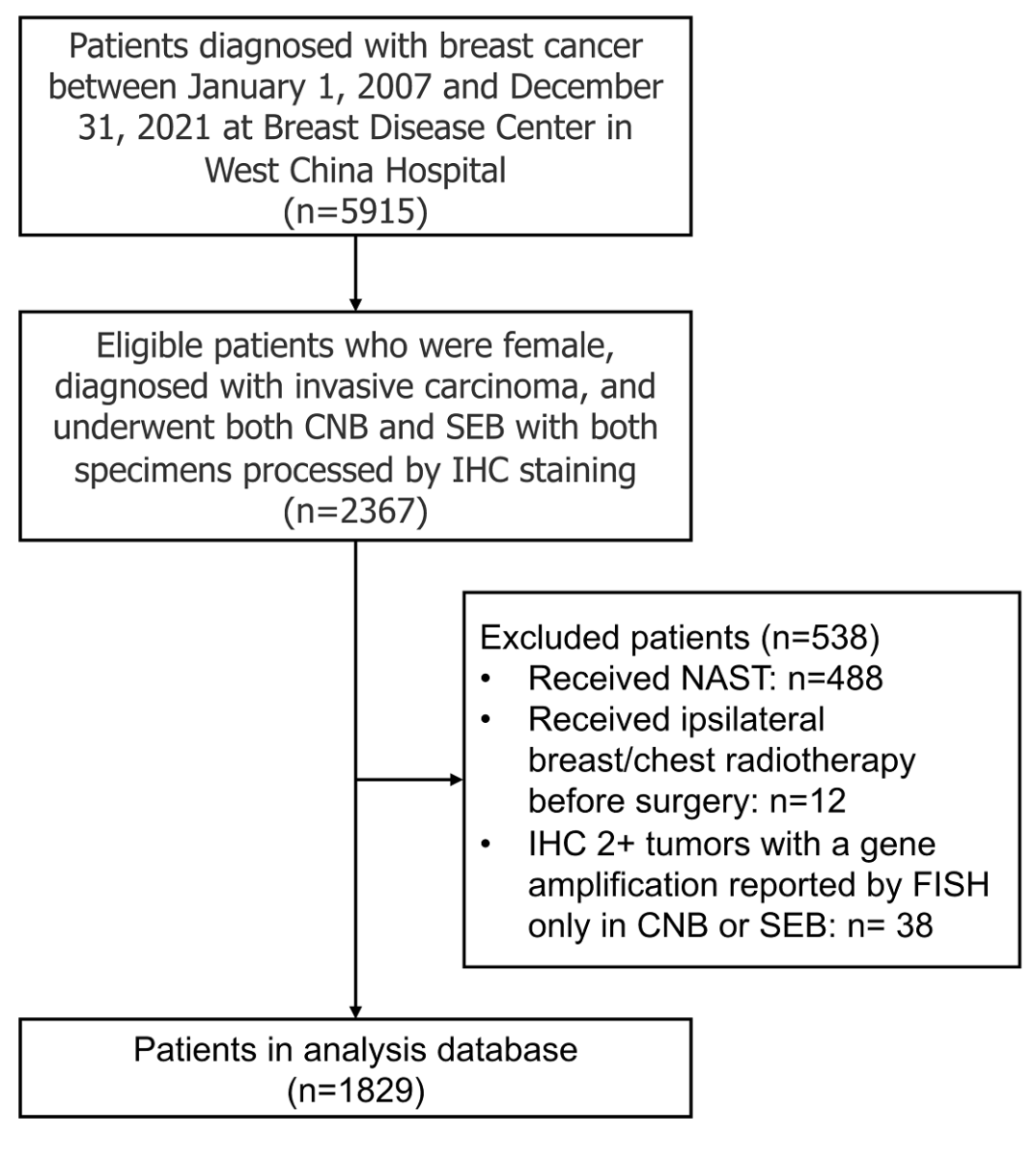 方法:选取2007年1月1日至2021年12月31日期间在四川大学华西医院就诊并符合纳排标准的乳腺癌患者,数据提取自医院信息系统(HIS)。通过一致率、κ值、灵敏度、特异度、阳性预测值和阴性预测值(PPV和NPV)来评估CNB和SEB之间HER2的一致性和CNB的诊断价值。使用逻辑回归模型来探索与两个标本间的不一致相关的潜在因素。