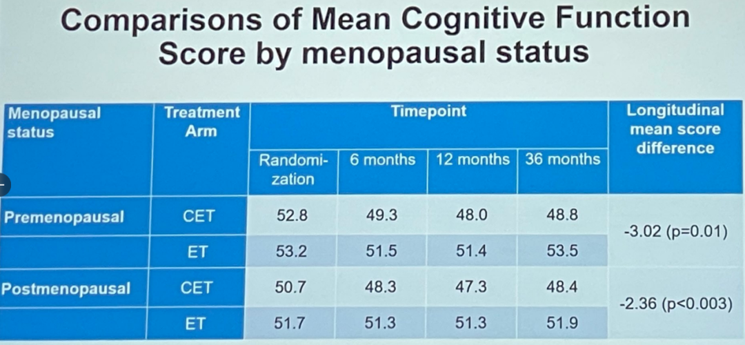 在这项子研究中,参与者完成了一份李克特五点计分调查表中的8项问卷,以评估基线、6个月、12个月和36个月的认知功能。RxPONDER PRO子研究的主要终点是治疗组的平均认知功能评分和绝经状态。其中,139名女性为绝经前(中位年龄48岁)患者,429名女性为绝经后(中位年龄62岁)患者。