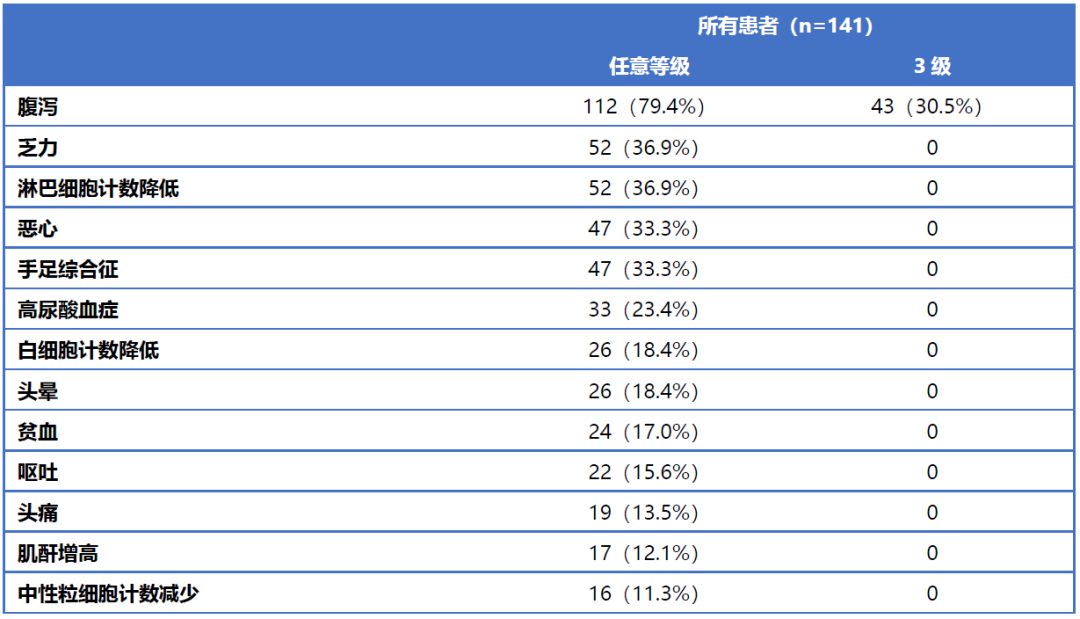 最常见的不良事件为腹泻(79.4%),其中43名患者(30.5%)发生了3级腹泻。其他常见不良事件为乏力(36.9%)、淋巴细胞计数降低(36.9%)、恶心(33.3%)、手足综合征(33.3%)等。没有发生4级及以上的不良事件。12名患者(8.5%)因不良事件导致停药。