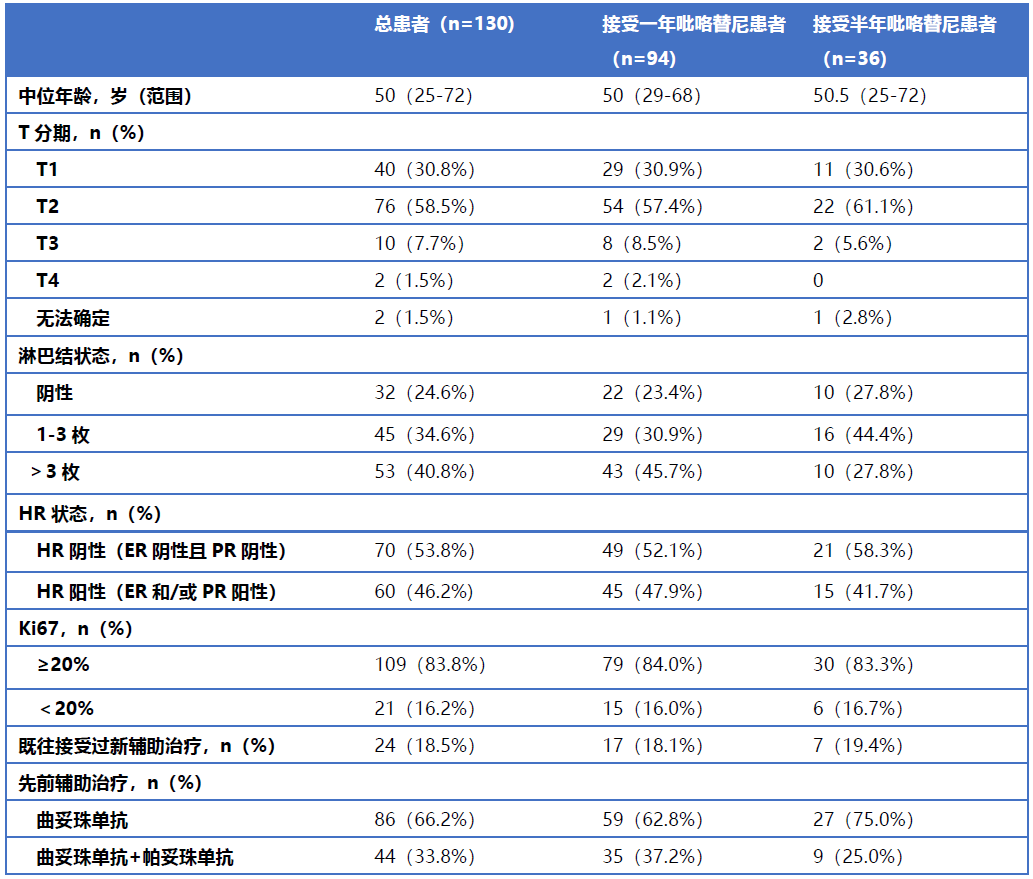 130名患者的中位年龄为50岁;90名患者(69.2%)T分期≥2;98名患者(75.4%)发生淋巴结转移,其中53名患者(40.8%)淋巴结转移>3枚;60名患者(46.2%)为激素受体阳性;24名患者(18.5%)既往接受了新辅助治疗,都未达到pCR;44名患者(33.8%)辅助阶段接受了曲妥珠单抗联合帕妥珠单抗双靶治疗。