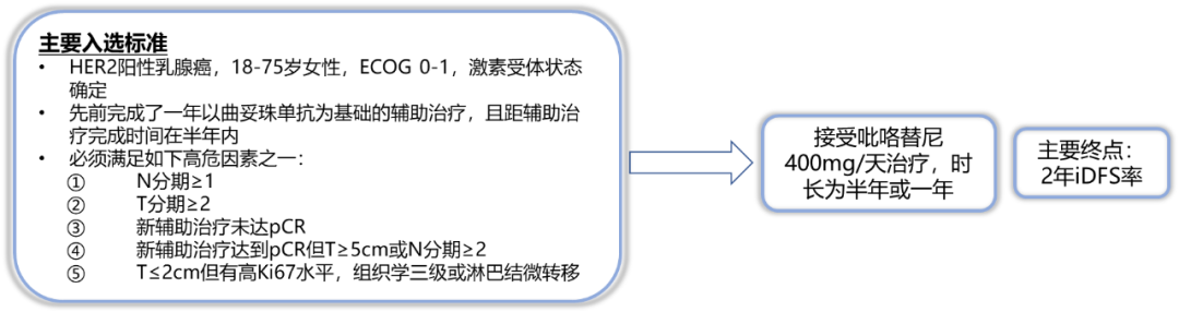 ExteNET研究显示,HER2阳性乳腺癌患者在曲妥珠单抗辅助治疗后接受1年的奈拉替尼治疗,可显著提高患者的无侵袭性疾病生存期。然而ExteNET研究由于开展时间较早,所纳入的人群均为新辅助/辅助治疗阶段采用曲妥珠单抗单靶治疗的人群,与目前新辅助/辅助治疗的标准治疗(曲妥珠单抗联合帕妥珠单抗)存在一定差异,亟需开展更贴近临床实践的研究,为患者带来更多获益。