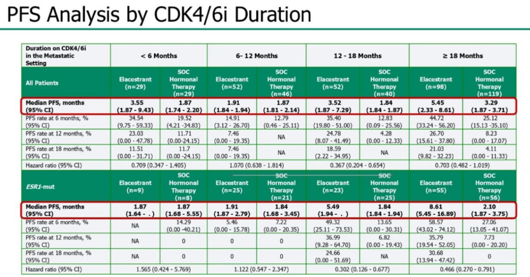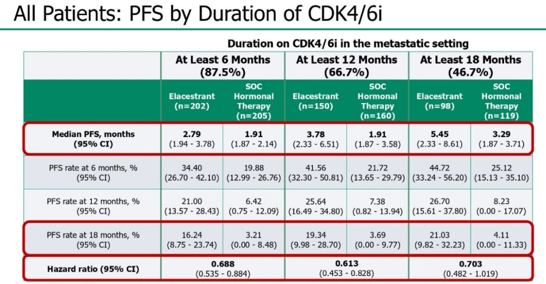 在至少接受18个月CDK4/6抑制剂治疗的队列患者中,elacestrant组与SOC组的疾病进展或死亡HR为0.703(95%CI:0.482~1.019)。PFS中位数分别为5.45 vs 3.29个月。在<6个月、6~12个月和12~18个月CDK4/6抑制剂治疗的队列患者中,elacestrant组和SOC组的PFS率分别为44.72%vs 25.12%、26.70%vs 8.23%、21.03%vs 4.11%。