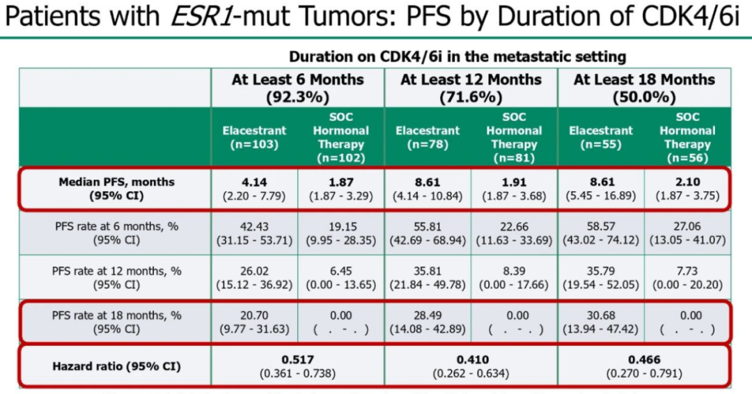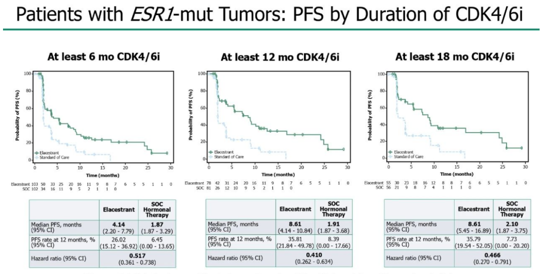在接受CDK4/6抑制剂治疗至少12个月治疗患者中,ESR1突变肿瘤患者elacestrant组(n=78)的中位PFS为8.61个月(95%CI:4.14~10.84),而SOC组(n=81)的中位PFS为1.91个月(95%CI:1.87~3.86),进展或死亡风险降低59%(HR 0.410;95%CI:0.262~0.634)。elacestrant组6、12、18个月的PFS率分别为55.81%、35.81%和28.49%,而SOC组为22.66%、8.39%和0%。