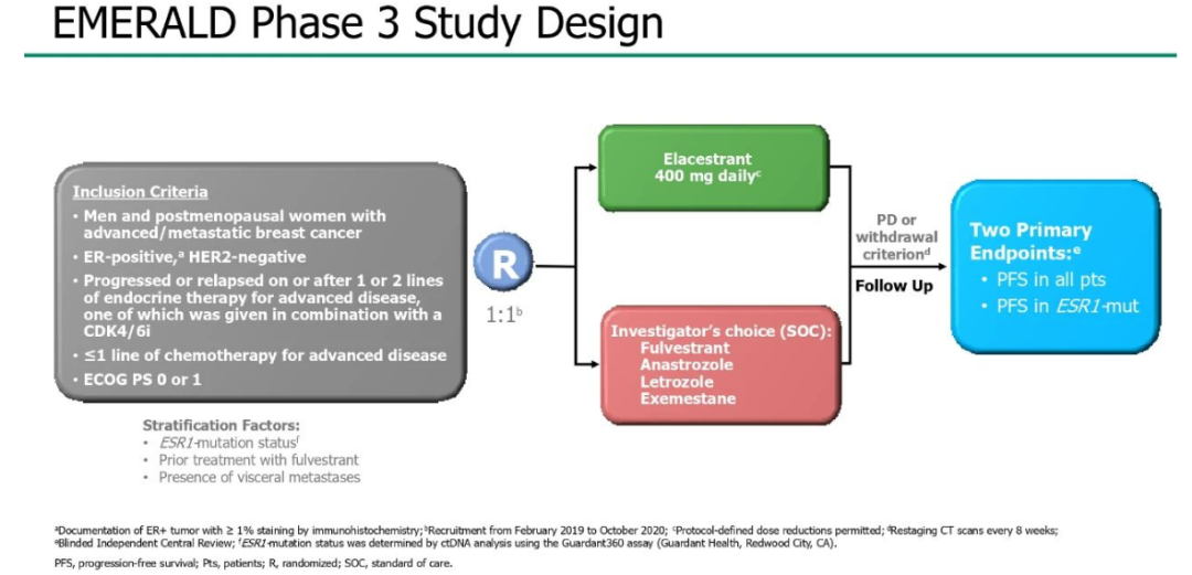 EMERALD(NCT03778931)是一项随机、开放的三期临床试验,招募既往接受过1-2线内分泌治疗、CDK4/6抑制剂和至多1次化疗的ER+/HER2-转移性乳腺癌患者;允许既往使用过氟维司群。患者被随机1∶1分配到elacestrant组(每日口服400毫克)或标准内分泌治疗组(SOC,研究者选择AI或氟维司群)。如果随机分配到对照组,既往接受氟维司群治疗的患者将接受AI,反之亦然。