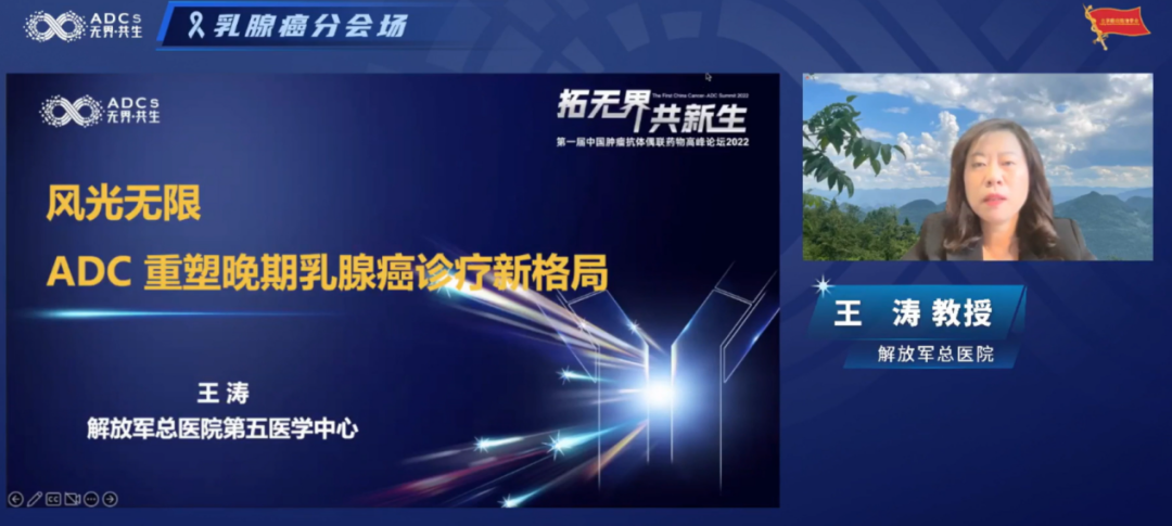 在中国科学院大学附属肿瘤医院(浙江省肿瘤医院)王晓稼教授教授的主持下,大会进入专题演讲环节二。解放军总医院王涛教授带来了“风光无限——ADC重塑晚期乳腺癌诊疗新格局”的讲课。