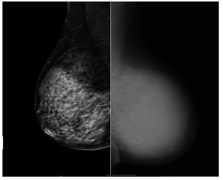 钼靶提示左乳弥漫性增高密度影,边界不清,恶性可能。双腋下未见肿大的淋巴结。BI-RADS 5(图2)。