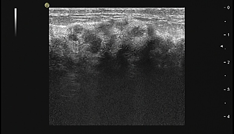 乳腺彩超提示左乳上方及外侧软组织水肿明显,上方10-3点距乳头2cm探及低回声,大小无法测量,深34 mm,形态不规则,边界不清晰,边缘毛刺,内部回声不均匀,后方回声衰减,后方胸大肌显示不清晰,彩色血流条状,RI 0.57。左侧腋下探及多个椭圆形中低回声区,大者约15*12 mm,边界尚清晰,淋巴门结构不清晰,彩色血流条状。BI-RADS 4B(图1)。