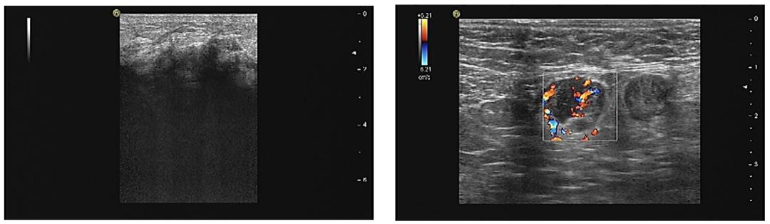 图1.乳腺彩超(左:乳腺;右:腋窝淋巴结)