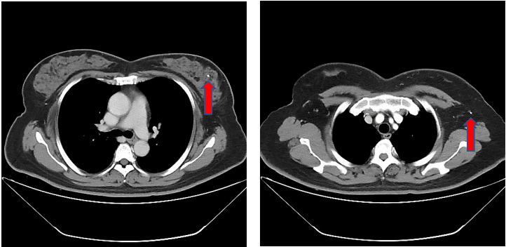 新辅助治疗6周期后再次CT评估,提示两肺未见明显异常密度影。纵隔内未见确切肿大淋巴结。双乳腺体致密,左乳局部可见点状高密度影,未见确切异常强化灶;双侧腋窝未见明显肿大淋巴结(图9)。