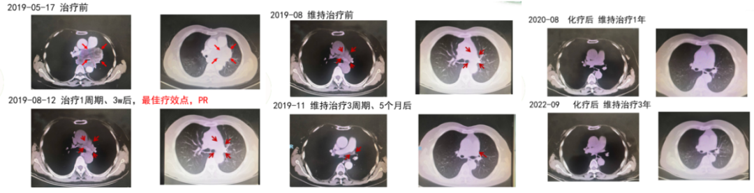 陈公琰教授:我院是CAPSTONE-1研究分中心之一,这位广泛期小细胞肺癌患者经过初筛符合纳入标准,2019年5月正式进入CAPSTONE-1研究,接受阿得贝利单抗联合化疗4-6周期,随后接受阿得贝利单抗维持治疗35个周期。在完成免疫联合化疗方案的第一个周期后,最佳疗效为PR。截止2022年9月,患者已经存活三年多,依然处于PR的状态,而且生活质量良好,没有明显的不适。主要不良反应是用药两个周期之后出现的贫血和白细胞降低,经过对症处理之后,患者很快恢复正常。通过这则病例,我们看到阿得贝利单抗联合化疗的疗效可观,患者对于不良反应的耐受性非常好。