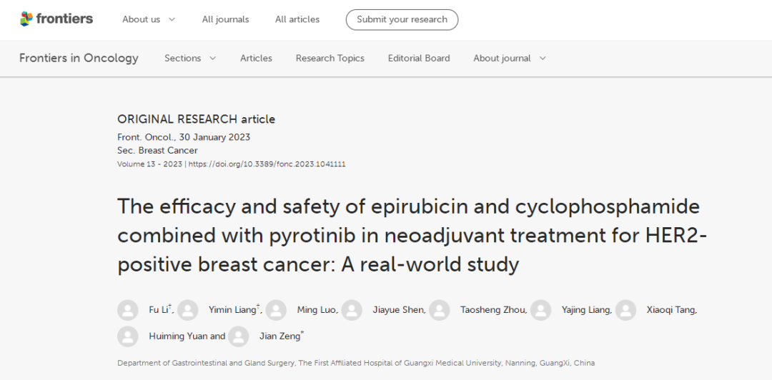 研究背景:蒽环类药物对人表皮生长因子受体2(HER2)阳性乳腺癌的长期生存益处是明确的。在新辅助治疗中,与曲妥珠单抗、帕妥珠单抗等单克隆抗体相比,新型小分子酪氨酸激酶抑制剂(TKI)吡咯替尼(pyrotinib)作为抗HER2策略的临床获益目前还需要更多的研究来确定。在Ⅲ期PHOEBE研究中,对于HER2阳性晚期乳腺癌患者,吡咯替尼+卡培他滨组的无进展生存期(PFS)明显高于拉帕替尼+卡培他滨组(12.5个月vs 6.8个月,风险比0.39;P<0.0001)。由广西医科大学附属第一医院胃肠腺体外科开展的真实世界研究,是中国首个评估表柔比星(E)和环磷酰胺(C)联合吡咯替尼作为抗HER2治疗的疗效和安全性的前瞻性观察研究,用于Ⅱ-Ⅲ期HER2阳性乳腺癌患者的新辅助治疗。
