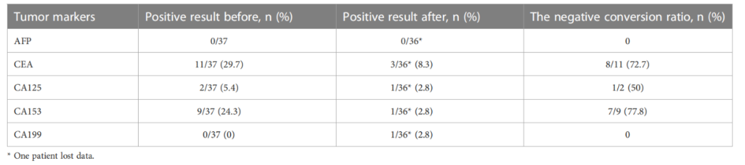 37例患者的客观缓解率为97.3%。2例达到临床完全缓解,34例获得临床部分缓解,1例病情稳定,无病情进展患者。35例手术患者中11例(31.4%)达到bpCR,腋窝淋巴结病理阴性率为61.3%。tpCR率为28.6%(95%CI:12.8~44.3%)。