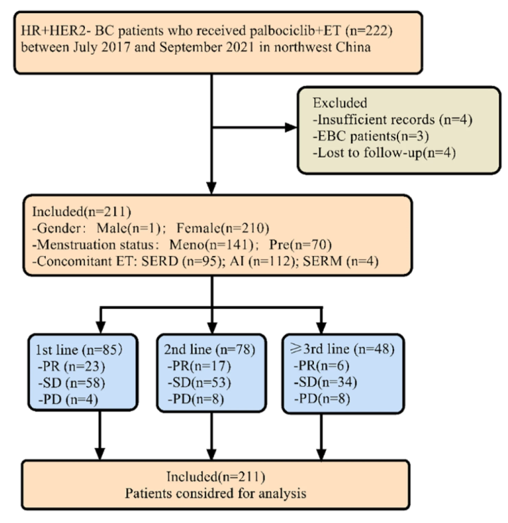 研究结果:2017年7月至2019年9月,共有222名接受Palbociclib治疗的MBC患者参加了这项研究,211名女性患者符合分析条件(图2)。
