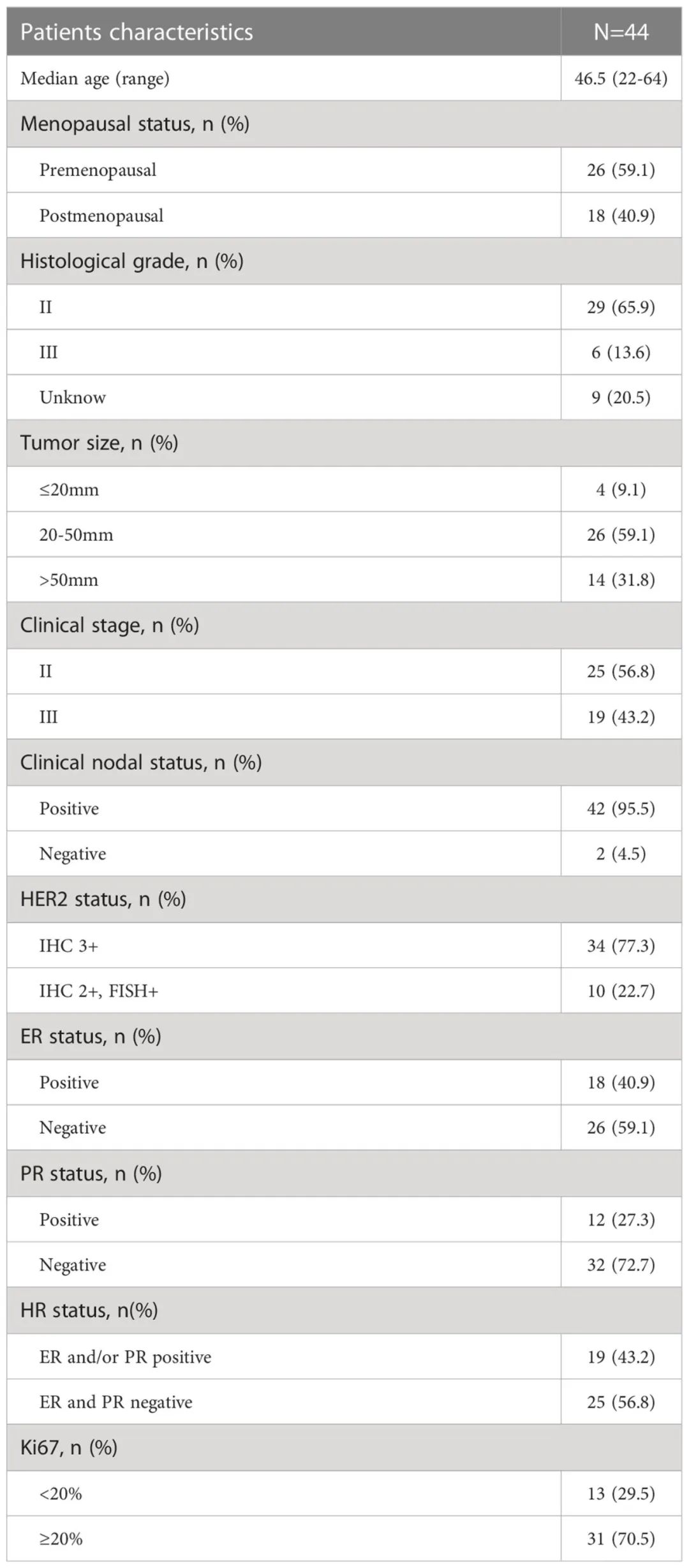 研究方法:从2019年5月至2021年12月,44例未经治疗的HER2阳性非特异性浸润性乳腺癌患者接受了4个周期的新辅助EC联合吡咯替尼治疗。主要终点为病理完全缓解率(pCR)。次要终点包括总体临床缓解率、乳腺病理完全缓解率(bpCR)、腋窝淋巴结病理阴性率和不良事件(AEs)。其他客观指标为手术保乳率、肿瘤标志物阴性转换率。