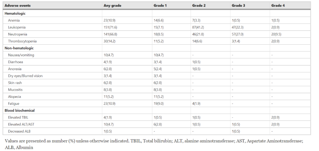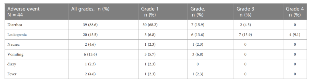 对所有44例患者进行了安全性评估。39例(88.6%)患者出现腹泻,2例为3级腹泻。4例(9.1%)患者出现4级白细胞减少。所有3~4级AE经对症治疗均可改善。