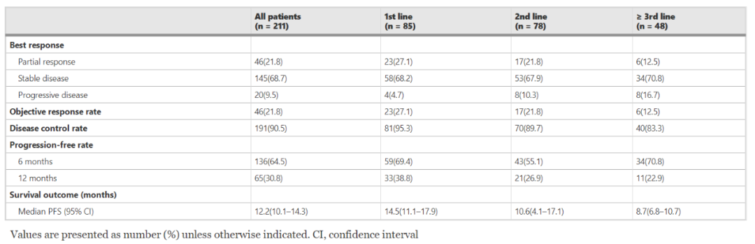 85名(40.3%)、78名(37.0%)和48名患者(22.7%)分别在一线、二线、三线或后线治疗中使用Palbociclib进行治疗。46例患者部分缓解,145例患者病情稳定,ORR为21.8%,疾病控制率为90.5%。中位随访14.2个月后,中位PFS为12.2个月(95%CI:10.1~14.3个月),中位总生存期未达到。