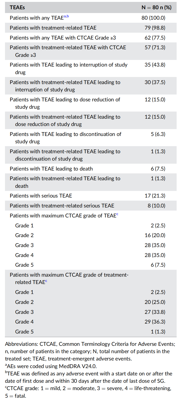 SG≥3级相关治疗发生不良事件(TEAEs)发生率为71.3%,最常见的AE是中性粒细胞计数下降(62.5%)、白细胞计数下降(48.8%)和贫血(21.3%)6.3%的患者因TEAE而停用SG。SG在重度预处理的中国mTNBC患者中表现出显著的临床活性。观察到的安全情况一般是可控的。