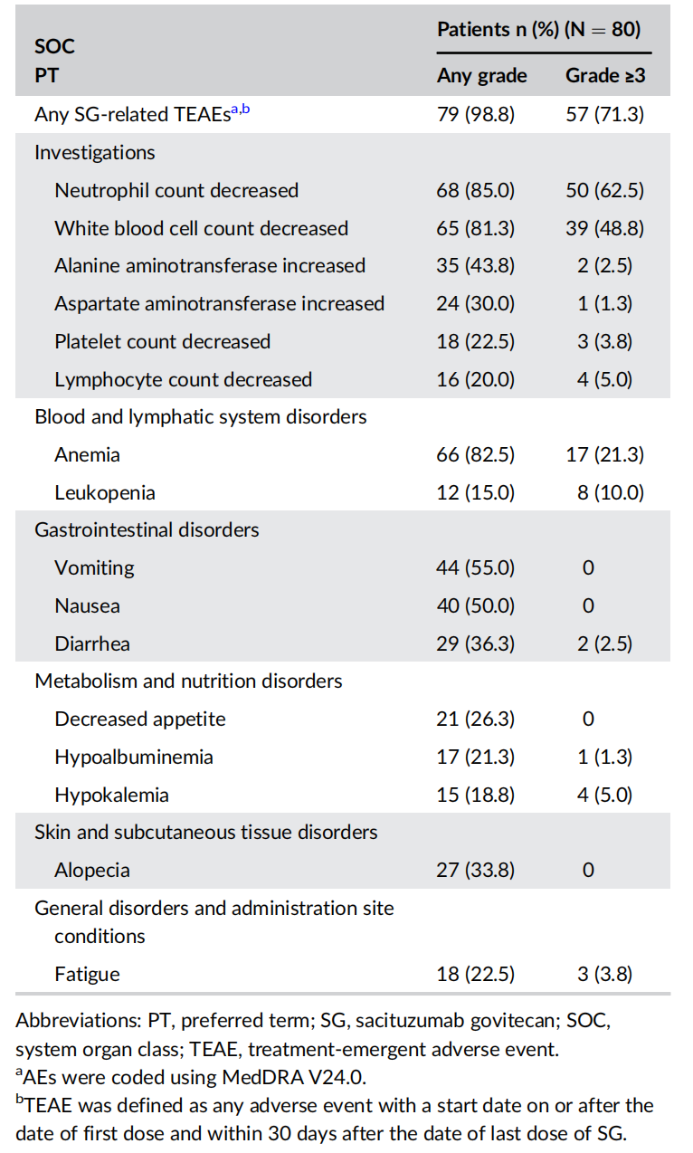 表7.与SG治疗相关的任何级别(≥20%的患者观察到)或≥3级(≥5%的患者观察到)最常见的TEAE