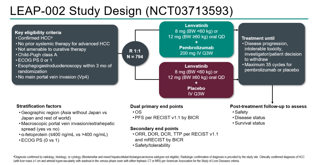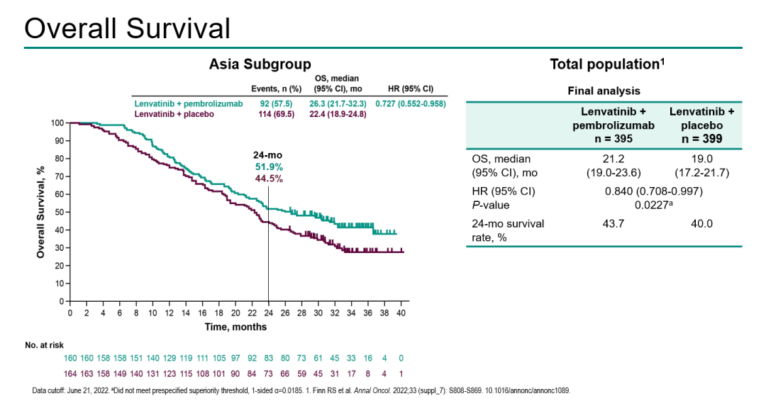 LEAP-002研究是一项全球、双盲、安慰剂对照III期临床研究,旨在确认针对HCC患者的一线治疗中,仑伐替尼联合帕博利珠单抗方案与仑伐替尼对比的疗效与安全性。本研究全人群共入组了794例晚期HCC患者,按1:1分组,其中亚洲人群仑伐替尼联合帕博利珠单抗方案组164例、仑伐替尼组160例。