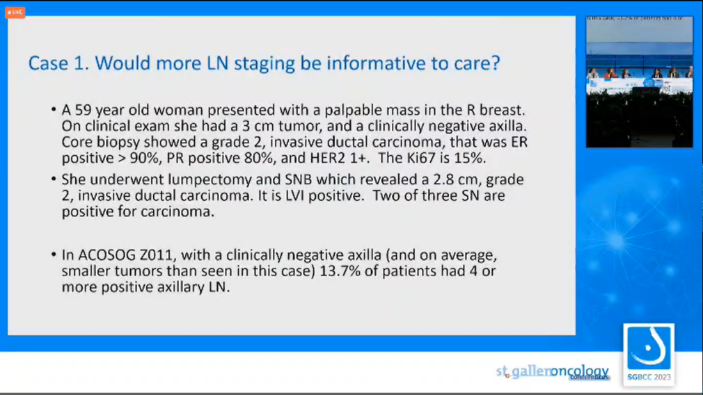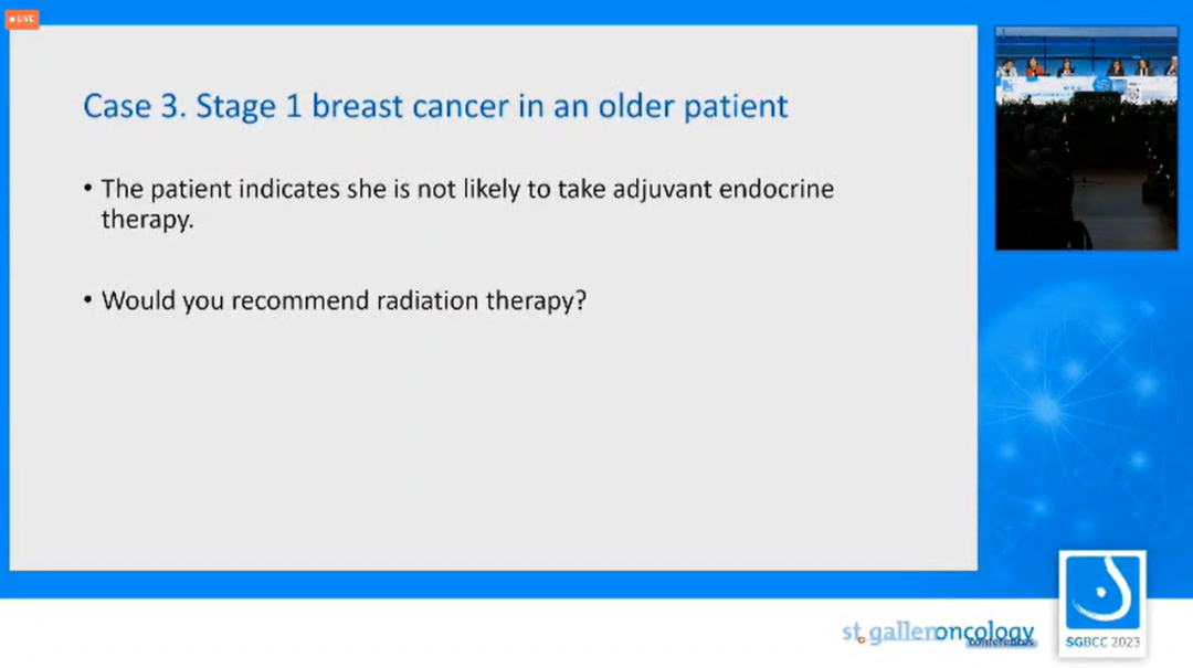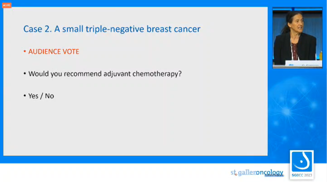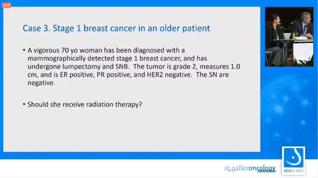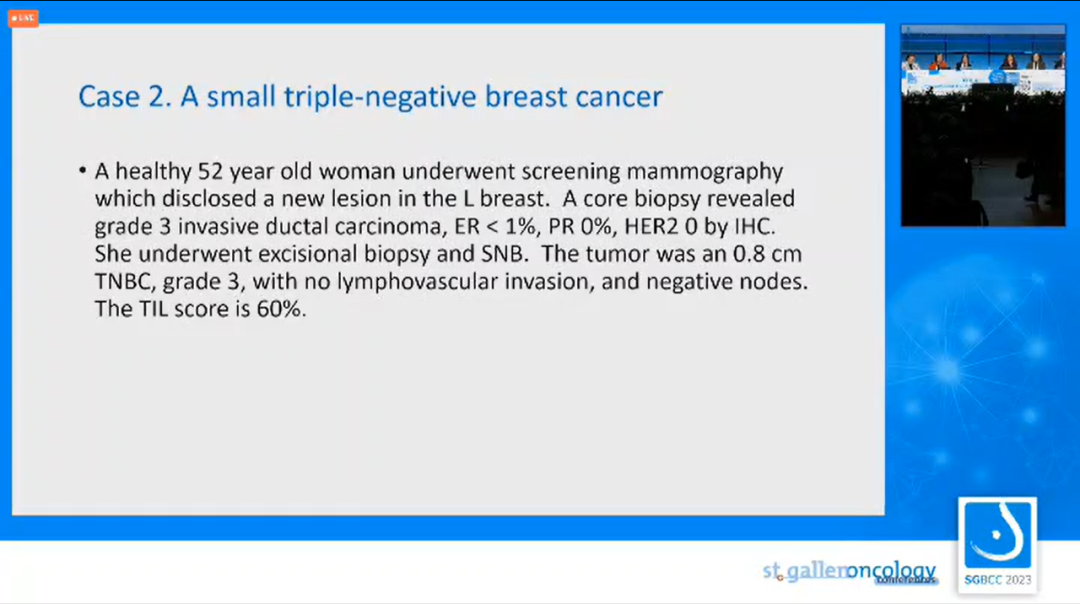 在“Interactive SessionⅡ——Too big,too small?Too low,too high?Adjuvant choices when stage and biology do not align”专场,与会专家就乳腺癌患者的早期辅助治疗问题以病例的形式进行了讨论(共12个病例,仅展示前3个)。