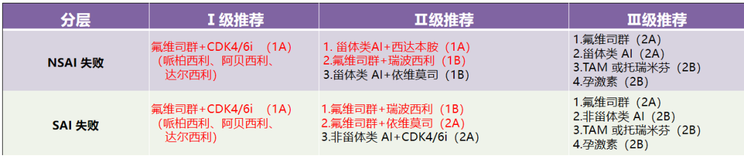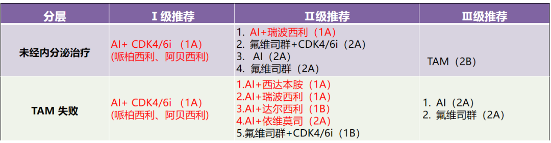 Ⅰ级推荐调整为氟维司群+CDK4/6i(哌柏西利、阿贝西利、达尔西利);SAI+西达本胺由Ⅰ级推荐调整为Ⅱ级推荐;Ⅱ级推荐新增氟维司群+瑞波西利;氟维司群(2A)由Ⅱ级推荐调整为Ⅲ级推荐。