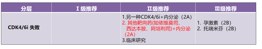 CDK4/6i治疗失败:Ⅱ级推荐中将“另一种CDK4/6i+内分泌”顺序前移;原“西达本胺+内分泌”调整为“其他靶向药(如依维莫司、西达本胺、阿培利司)+内分泌”。