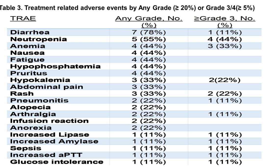 最常见的任何级别治疗相关不良事件(TRAEs)包括腹泻(78%)、中性粒细胞减少症(55%)、贫血(44%)、恶心(44%)、疲劳(44%)、低磷血症(44%)、瘙痒(44%)等。常见的≥3级TRAEs有中性粒细胞减少症(44%)、贫血(33%)、低钾血症(22%)、皮疹(22%)等。