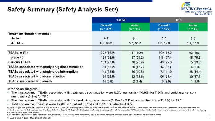 在亚洲亚组中,T-DXd和TPC治疗期间不良事件(TEAEs)的发生率相似,但T-DXd治疗的≥3级TEAEs发生率低于TPC治疗(59.2%vs 76.2%),这与总人群中的≥3级TEAEs发生率一致。两组的严重TEAEs相似(25.9%vs 23.8%);TEAEs导致的停药率分别为17.7%和6.3%,减药率分别为28.6%和47.6%。