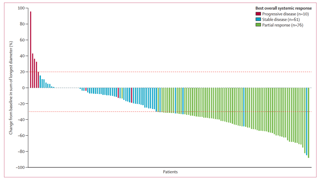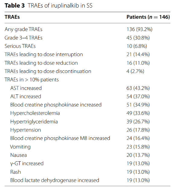 安全性:全组有93.2%的患者出现治疗相关任何级别不良反应,其中,3度及以上不良反应发生率为30.8%,分别有14.4%和11.0%的患者因治疗相关不良反应而导致治疗中断及剂量降低。最常见的导致剂量降低的原因为AST升高(2.7%)和皮疹(2.1%)。2.7%的患者因治疗相关不良反应导致永久性终止治疗。
