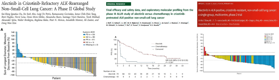 在名为ALUR研究的III期随机对照研究中,研究者纳入既往接受克唑替尼治疗以及含铂双药化疗后进展的ALK阳性NSCLC患者,按照2:1的比例随机分为阿来替尼600mg,口服,每日两次或化疗(培美曲赛500 mg/m2或多西他赛75 mg/m2,每三周一次),结果发现,研究者评估的中位PFS分别为10.9个月和1.4个月,HR=0.20,ORR分别为50.6%和2.5%。两组中位OS分别为27.8个月和未达到。在另一项单臂临床研究中,研究者纳入既往接受克唑替尼治疗后进展的ALK阳性NSCLC患者给予600mg,口服,每日两次的阿来替尼治疗,在纳入的138例患者中,全组患者ORR为49%,中位PFS为8.9个月,颅内ORR为57%,颅内DOR为10.3个月。第三项单臂临床研究共纳入87例接受克唑替尼治疗后进展的患者,治疗剂量同样为600mg,口服,每日两次。全组ORR为48%,中位PFS为8.1个月。