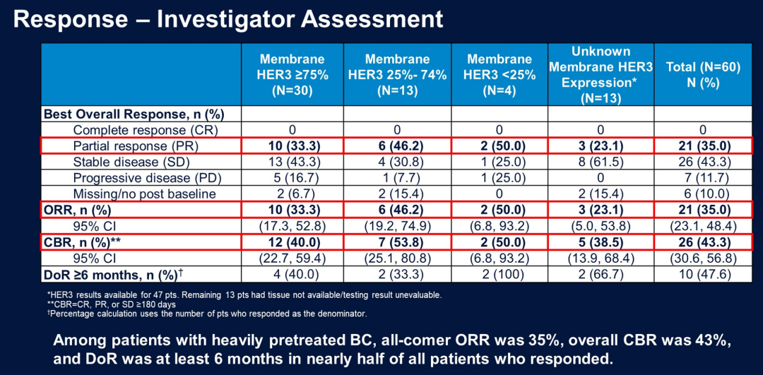 研究结果显示:总体人群的ORR为35%(95%CI:23.1~48.1),临床获益率(CBR)为48%(95%CI:35.2~61.6);亚组分析中,HER3≥75%、HER3 25%~74%患者的ORR分别为33.3%和46.2%,CBR分别为50%和54%,HER3<25%无法评估疗效(仅有4例可评估,ORR和CBR均为50%);总体人群的中位持续缓解时间(DOR)为10.0个月(95%CI:5.5~未达到);6个月PFS率为60%,HER3≥75%、HER3 25%~74%患者的6个月PFS率分别为50%和70%。