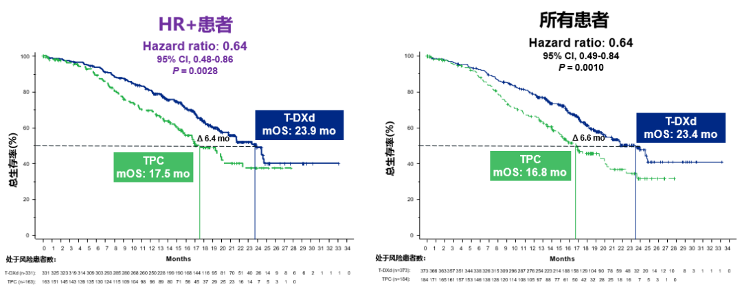 在生存获益评价方面,大多数医生仍然将总生存期(OS)视为最经得起检验的“金标准”。DB04研究同样获得OS阳性结果,T-DXd治疗HR+患者的中位OS达到近两年,比对照组延长了半年以上(23.9 vs 17.5个月),死亡风险则显著降低36%(HR 0.64,95%CI:0.48~0.86,P=0.0028);全体人群和HR-患者有相似获益。值得一提的是,这是目前唯一证实在CDK4/6抑制剂经治后取得生存获益的靶向治疗。