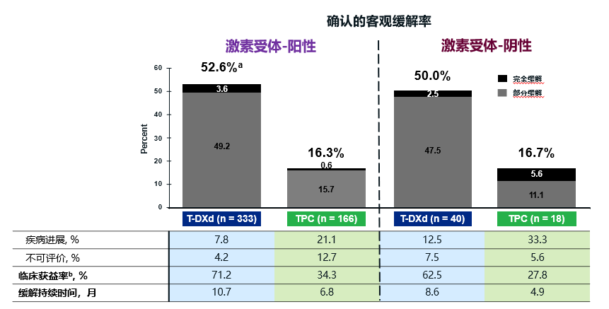 客观缓解率(ORR)是临床关注的近期疗效指标,以往通常认为化疗是起效最快的药物。但在DB04研究中,T-DXd组的ORR是化疗组的三倍多(HR+患者:52.6%vs 16.3%;TNBC患者:50.0%vs 16.7%)。