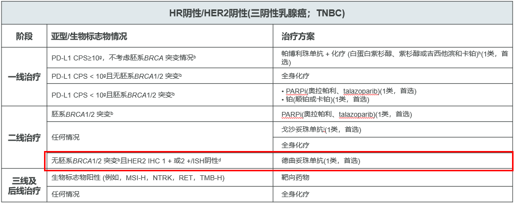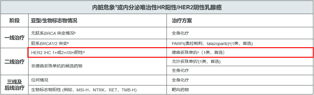 基于DB03研究,T-DXd已经成为国内外指南一致推荐的二线治疗新标准;而基于DB04研究,国际权威指南则将HR+/HER2-晚期乳腺癌和TNBC的治疗推荐重新洗牌。在2023 v1版NCCN指南中,T-DXd是内脏危象或内分泌难治性HR+/HER2-晚期乳腺癌二线治疗的1类优选推荐方案;同时也是晚期TNBC二线治疗的1类优选推荐方案[14]