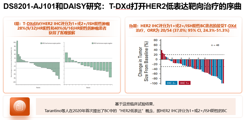 药物机制的改进带来疗效和安全性的飞跃,使T-DXd可以有效克服肿瘤HER2表达的异质性,不仅能轻松拿捏HER2阳性乳腺癌,还能使HER2低表达乳腺癌无所遁形。在DS8201-AJ101、DAISY等1/2期研究的初步探索中,T-DXd用于经多重治疗的HER2低表达ABC展现了积极的抗肿瘤活性[9-10],希望的曙光开始照进这片治疗“盲区”,揭开了HER2低表达乳腺癌抗HER2治疗的序幕。
