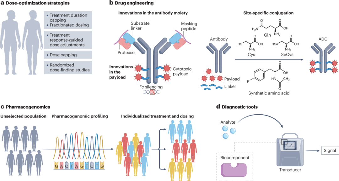 由于ADC的不良反应多为剂量依赖性,因此对ADC安全性的优化可从剂量调整层面入手,包括设置剂量上限、治疗持续时间上限、给药频次优化、临床反应引导的剂量调整、随机剂量确认研究五种策略。