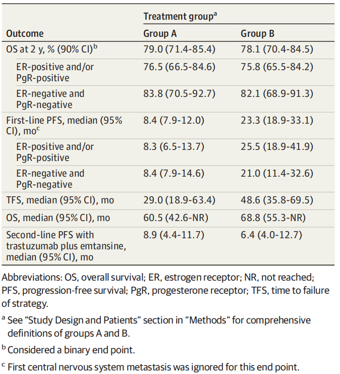 在一项随机、开放标签的Ⅱ期临床试验中,研究者检验了以下假设:(1)与一线化疗加双重抗HER2治疗相比,初始无化疗方案(包括两种抗HER2药物,随后在疾病进展时给予曲妥珠单抗加T-DM1)不会影响OS,具有更少的毒性作用和更好的QOL;(2)HER2过表达型患者接受双重HER2阻断治疗的应答优于非HER2过表达型患者。