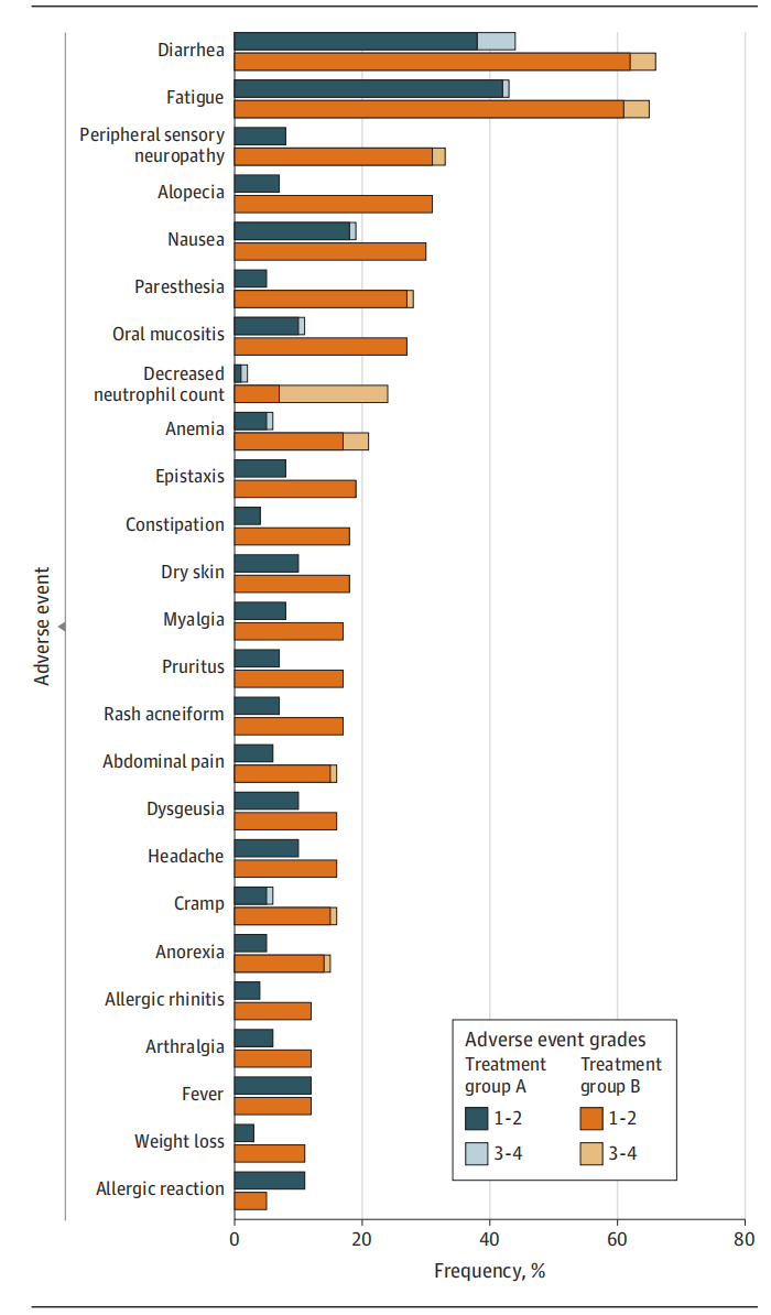 除血液学毒性作用外,大多数不良事件为1级或2级,除了发热和过敏反应外,几乎所有不良事件在未接受化疗的患者中都不太常见(图3)。