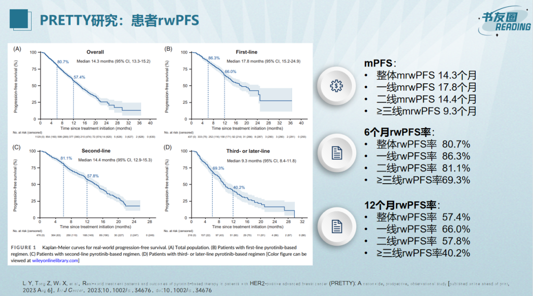 截至2022年5月29日,中位随访时间为11.8个月,总人群的中位rwPFS为14.3个月(95%CI:13.3~15.2);6个月PFS率和12个月PFS率分别为80.7%和57.4%。晚期一线、二线以及≥三线的中位rwPFS分别为17.8个月(95%CI;15.2~24.9)、14.4个月(95%CI:12.9~15.3)和9.3个月(95%CI:8.4~11.8)。在研究期间,140例患者在疾病进展后继续使用吡咯替尼,rwPFS2为4.2个月。总人群的中位OS为NR,12个月OS率为89.1%。晚期一线、二线、以及≥三线的12个月OS率分别为92%、90.1%和81.4%。