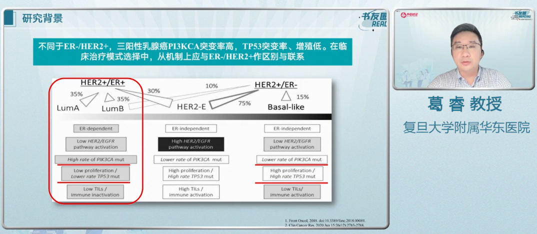 葛睿教授在讲课中指出,三阳性乳腺癌(HR+/HER2+)是一种独特的分子亚型,占所有乳腺癌的10%左右,占HER2阳性乳腺癌的50%,但不同于ER-/HER2+,三阳性乳腺癌PI3KCA突变率高,TP53突变率、增殖低。在临床治疗模式选择中,从机制上看与ER-/HER2+应作区别与联系。