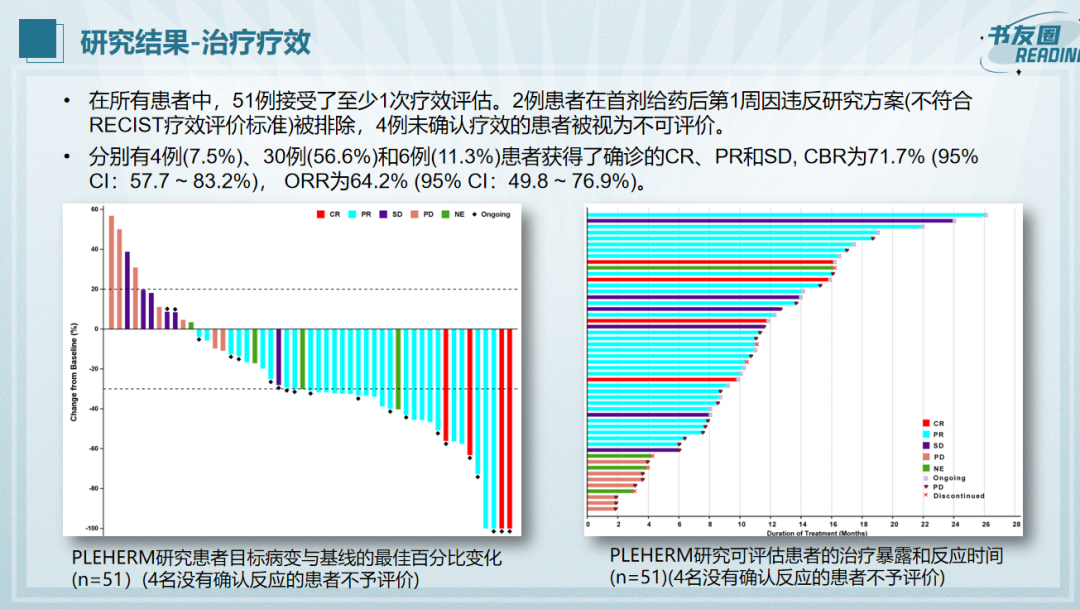 截至2022年8月,中位随访时间为11.6个月(95%CI:8.7~14.0个月)。23例(43.4%)患者处于绝经前或围绝经期。分别有32例(60.4%)、12例(22.6%)和25例(47.2%)患者曾接受化疗、曲妥珠单抗和内分泌治疗。在所有患者中,51例接受了至少1次疗效评估。2例患者在首剂给药后第1周因违反研究方案(不符合RECIST疗效评价标准)被排除,4例未确认疗效的患者被视为不可评价。分别有4例(7.5%)、30例(56.6%)和6例(11.3%)患者获得了确诊的CR、PR和SD,CBR为71.7%(95%CI:57.7~83.2%),ORR为64.2%(95%CI:49.8~76.9%)。
